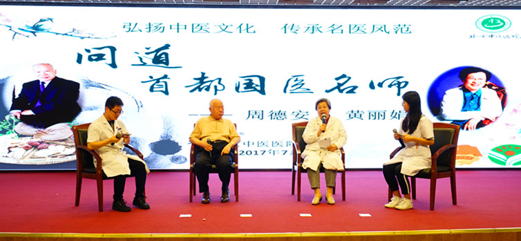 7月25日, 由北京中医医院团委主办,针灸中心、心血管科承办,青年文明号开放周系列活动之“弘扬中医文化 传承名医风范”——问道国家级名老中医交流会在多功能厅举行。活动邀请两位德高望重的首都国医名师周德安教授、黄丽娟教授,院党委副书记、纪委书记程军,针灸科主任李彬、心血管科主任刘红旭,学术继承人及全院团员青年代表150余人出席。