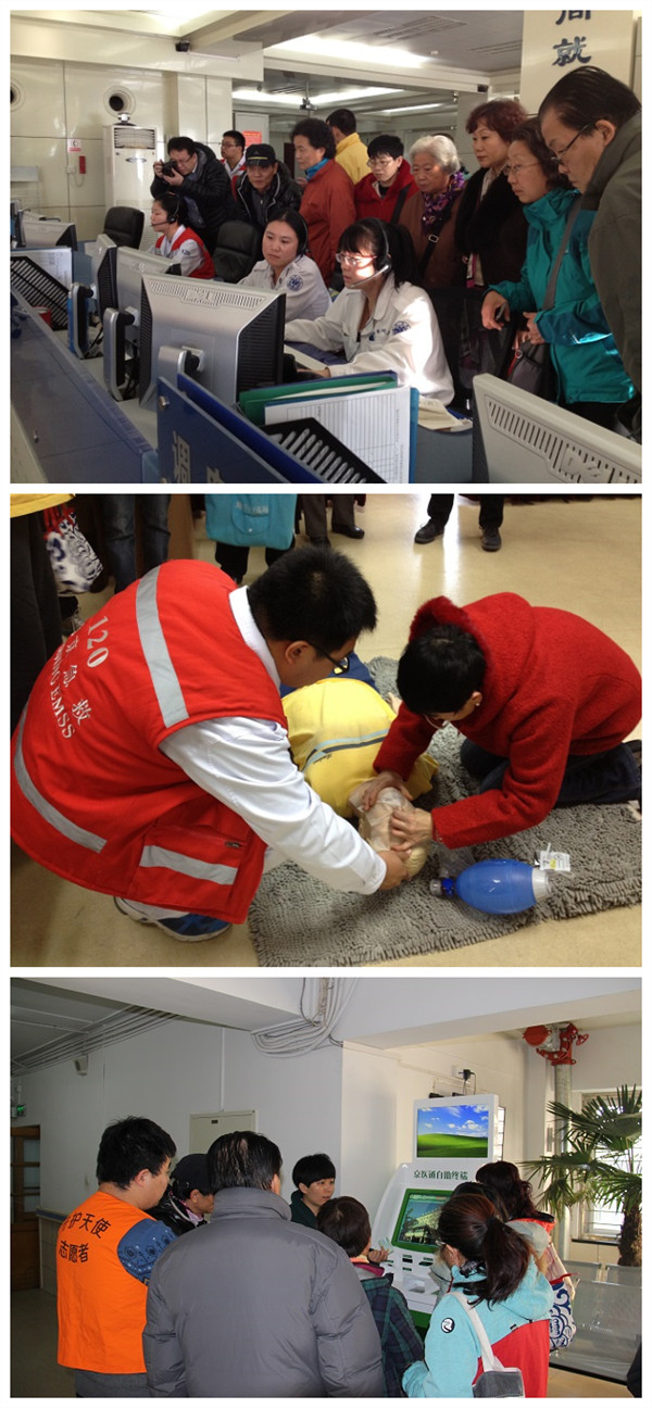 11月28日上午,组织志愿者到北京市120急救中心进行培训学习。志愿者详细了解了120工作流程、观摩急救演练、并学习了心肺复苏术等紧急救护技能。12月4日,组织志愿者学习使用医院新近上线运行的“京医通”自助机,通过讲课、实际操作了解其功能和服务内容。