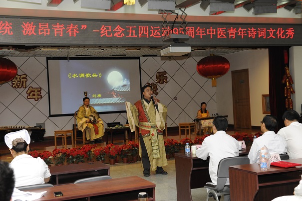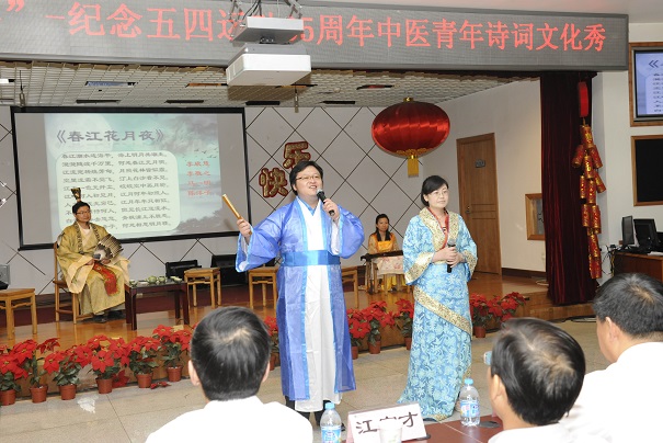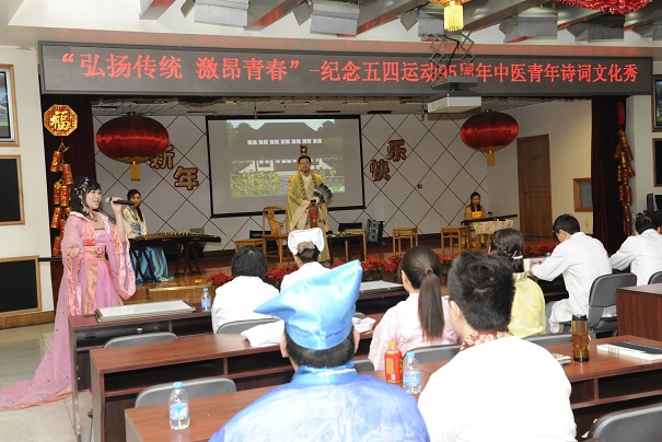 之后,演出了由团委精心策划、编排的“弘扬传统 激昂青春”—— 中医青年诗词文化秀。整场节目以古代老夫子宴请众宾客、以诗会友为背景,以春夏秋冬四季更迭为主线,将古诗词吟诵、古曲弹唱、古典舞有机结合,并穿插听诗猜中药名、汉字听写等现场互动环节,以诗词文化秀的方式演绎出了古人品茶饮酒,对辞吟诗的美好意境。整体创意新颖、独到,节目串联自然、风趣,带领大家共同走进中国古代文化世界,感受它的无穷魅力。同时,也表达出了,无论是现在,还是在科技飞速发展的未来,古代文化都是中华民族的瑰宝,闪闪发光。作为当代中医药人,弘扬和传承古代文化是我们的社会责任,更是历史使命。