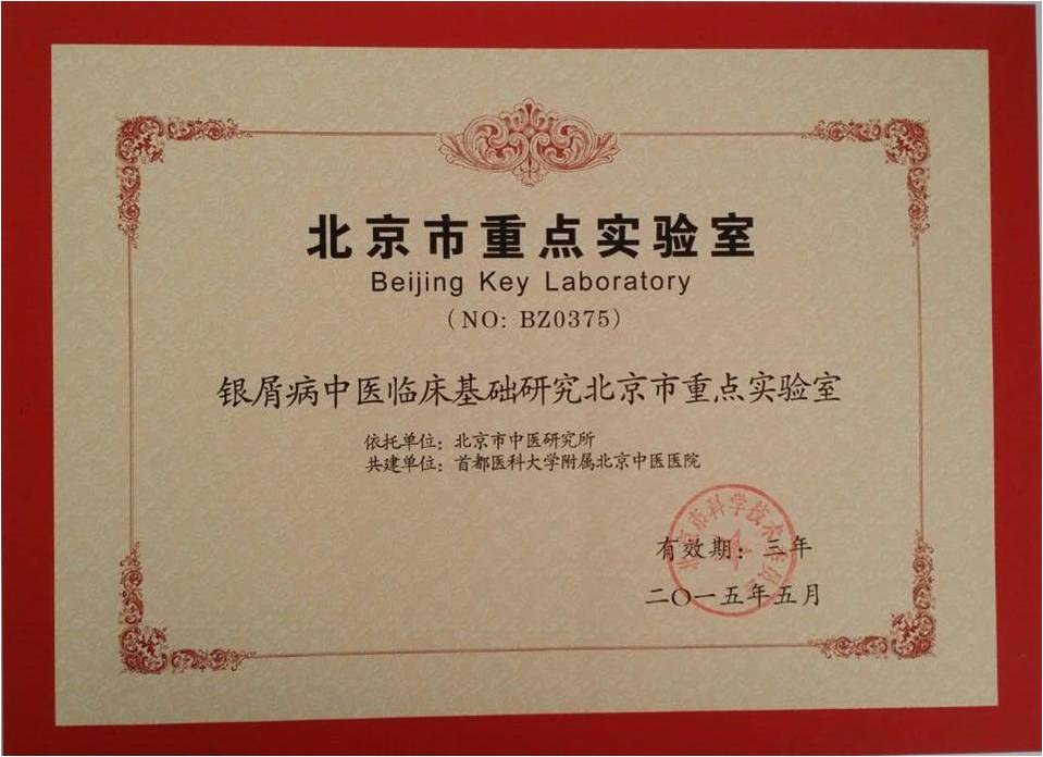 银屑病中医临床基础研究北京市重点实验室于2015年6月获北京市科委批准挂牌。依托单位为北京市中医研究所,共建单位是首都医科大学附属北京中医医院。本实验室在中医药治疗银屑病的临床优势和社会需求的基...