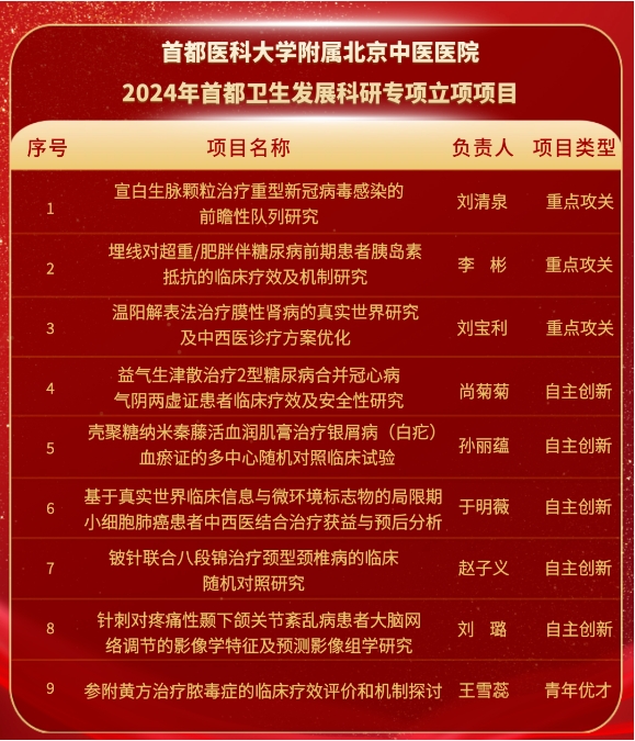 近日,北京市卫健委2024年首都卫生发展科研专项项目正式立项名单公布,北京中医医院共有9个项目入选。