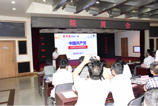 6月20日,我院根据《2016年党风廉政建设和反腐败工作要点》,结合“两学一做”实施方案,利用院周会开展“清风堂”系列讲座,第一讲--《中国共产党纪律处分条例总则部分解读》,由党委副书记兼纪委书记程军同志开讲,院领导和全体中层干部及临床科室护士长等百余人聆听了讲座。