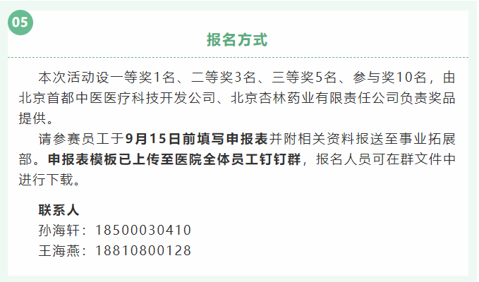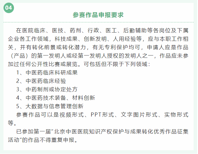 为贯彻落实习近平总书记关于创新发展的讲话精神,通过党建引领和文化推动,增强医院全体人员知识产权保护与成果转化意识,促进科技成果创新与转化,在医院党委的领导与支持下,北京中医药知识产权保护服务中心、事业拓展部、党委办公室、宣传中心联合举办第二届“北京中医医院知识产权保护与成果转化优秀作品征集活动”,拟通过本次活动,展现在院党委领导下中医药知识产权保护与成果转化取得的成果,推动医院在知识产权保护与成果转化方面的文化建设,为医院创新发展与高质量发展贡献力量。
