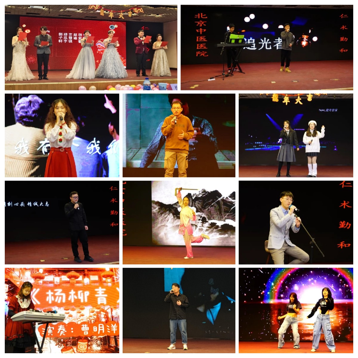 心血管科张振民、肿瘤科程培育、针灸科姬旭及教育处盛巡四位老师带来了幽默的三句半表演,引来台下笑声阵阵。