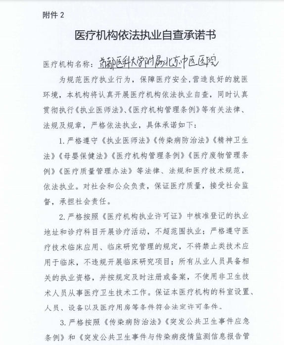 根据北京市卫健委、北京市卫生监督所等上级部门的要求,我院加强依法执业管理,在营业范围、人员资质审核认定、技术备案、互联网医疗等方面进行备案管理,加强