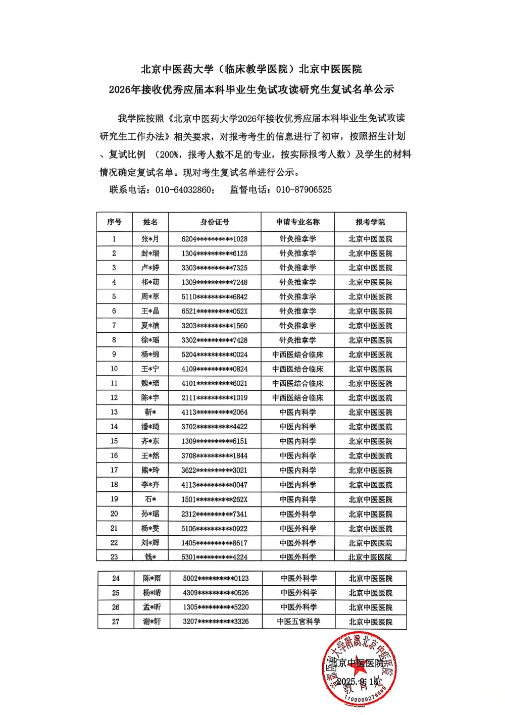 北京中医药大学(临床教学医院)北京中医医院2026年接收优秀应届本科毕业生免试攻读研究生复试名单公示