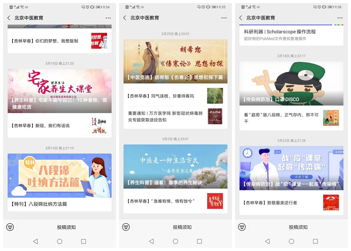 我院规培基地的住院医师们利用微信及朋友圈等,对亲友们宣传新冠病毒肺炎防控知识,中医养生等,答疑解惑的同时缓解了大家普遍的焦虑情绪,也提高了自身的专业能力。研究生、本科生们充分利用北京中医教育微信公众平台,在疫情防控、舆论宣传、科普等方面发挥了医学生优势。目前已发布《武汉雄起!中国雄起!》、《宽街中医人在一线》、《疫情中的一天》、《我们都是宽街中医人!》、《看“超哥”版八段锦,正气存内,邪不可干》、《胡希恕伤寒论思想初探》、《致敬最美逆行者》、《战疫课堂-起底传染病》、《八段锦吐纳方法》、《宅家不能亏自己:10种食物,做健康吃货》、《新冠,我们有话说》、《大疫当前,中医从未缺席》等文章,获得了较高的点击量和关注。